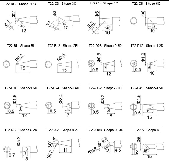 T22系列焊咀 (另外选购),适用于FM2030 (单位:mm)